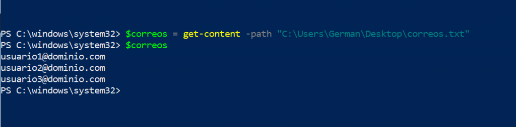 utilizamos el comando$correos = Get-Content -Path D:\misdatos\correos.txt