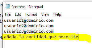 Para crearla utilizaremos un archivo de texto llamado correos con una lista de correo en el formato siguiente